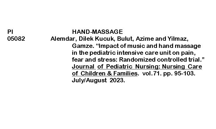 PERIODICAL INDEXING (JOURNAL OF PEDIATRIC NURSING) ByRenalyn Aguayon January 28, 2026January 29, 2026 Impact of music therapy and hand massage in the pediatricDownload