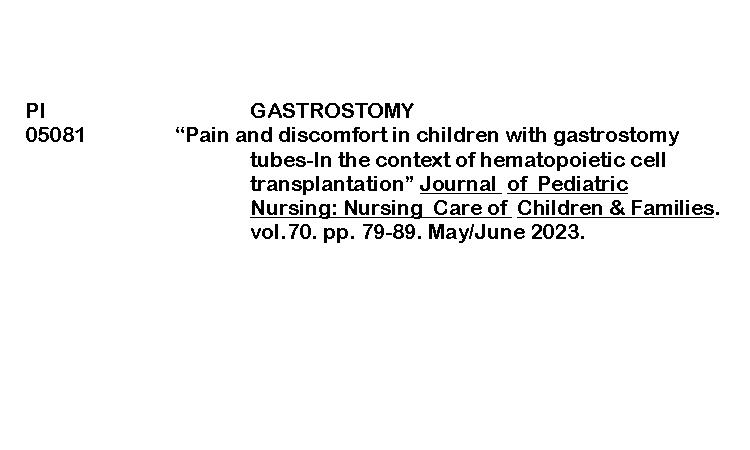 PERIODICAL INDEXING (JOURNAL OF PEDIATRIC NURSING) ByRenalyn Aguayon January 22, 2026January 30, 2026 Pain and discomfort in children with gastrostomy tubesDownload