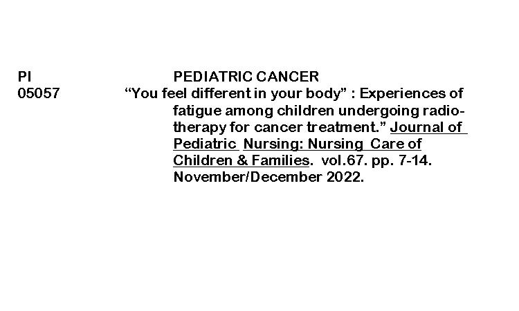 PERIODICAL INDEXING (“You feel different in your body” : Experiences of fatigue among children undergoing radiotherapy for cancer treatment) ByRenalyn Aguayon March 3, 2026March 3, 2026 Experience of fatigue among childrenDownload